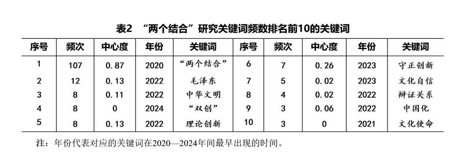 “两个结合”研究关键词相关度分析。关键词出现的频率往往反映某段时间该领域的研究热点。因知识计量分析对数据“净度”要求较高,为保障研究精度,笔者又以人工方式对上述文献进行数据清洗,人工比对和阅读每一篇文章的摘要、关键词等基本信息,删除与“两个结合”主题相关度较低的文献,得到时间跨度为2020年至2024年的有效文献256篇,以此作为CiteSpace关键词分析的样本数据。在本研究所选取的256篇论文中,样本中词频排在前10位的关键词分别是“两个结合”(107)、毛泽东(12)、中华文明(8)、“两创”(8)、理论创新(8)、守正创新(7)、文化自信(5)、辩证关系(4)、中国化(3)、文化使命(3),关键词的中心度越强,说明其与主题联系越紧密(如表2所示)。