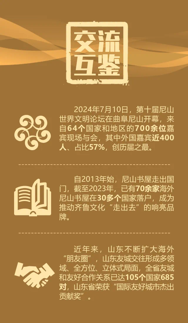 让“孔夫子的话越来越国际化”,不断丰富友人来鲁访学研学活动形式,持续壮大海外“朋友圈”……近年来,山东充分发挥齐鲁文化的独有优势,深入推进中华优秀传统文化“两创”,搭建文明交流互鉴高端平台,开展形式多样的对外文化交流活动,围绕友城、友校、友企、友媒、友人“五友”外宣进一步拓展国际交流合作,努力讲好中国故事山东篇章,不断推动山东文化走向世界。