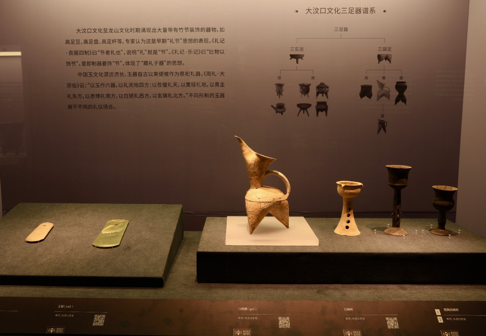 山东曲阜出土的大汶口文化时期的白陶鬹、黑陶高柄杯、玉钺等展示。