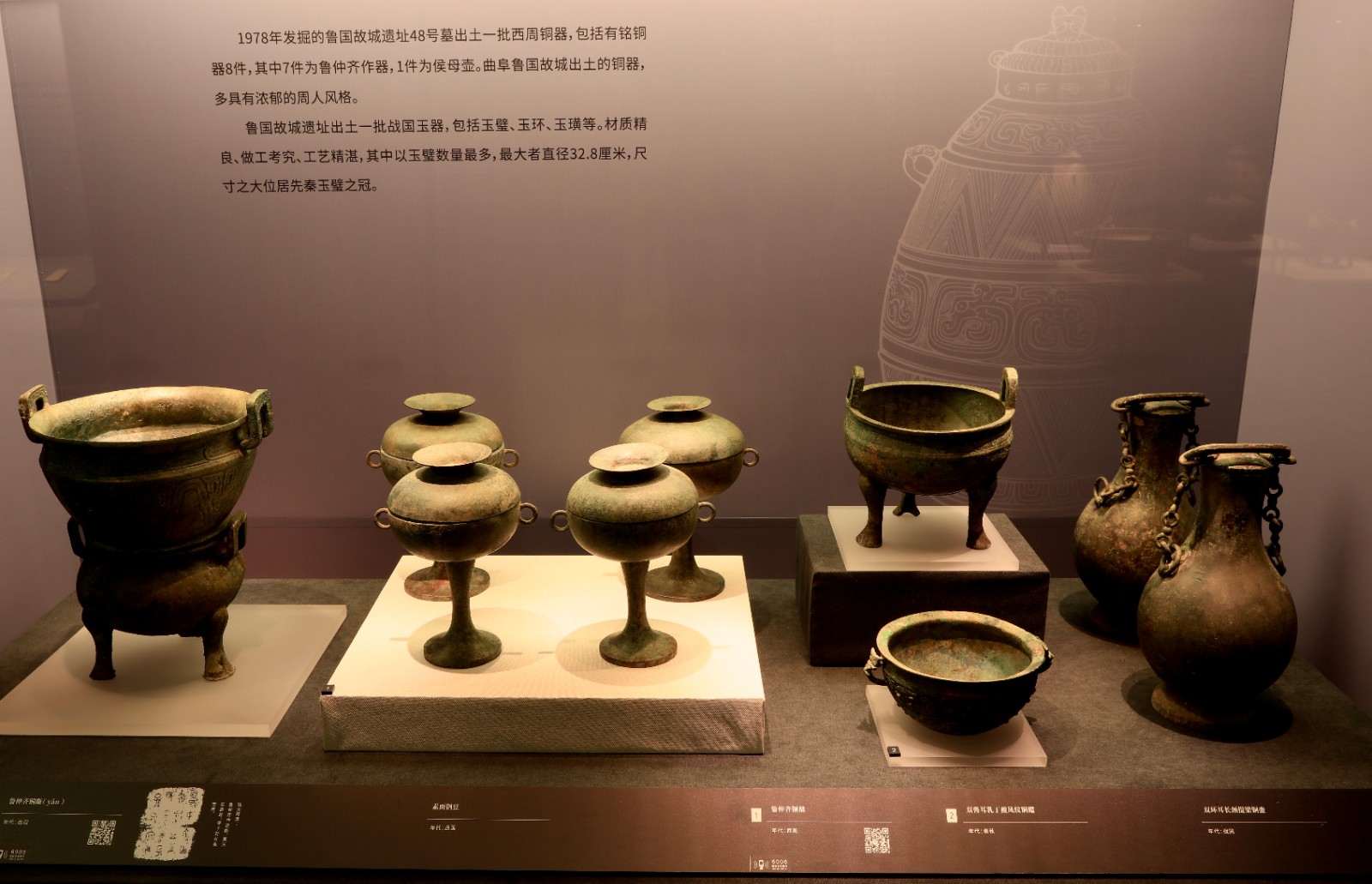 山东曲阜鲁国故城遗址出土的西周铜甗、铜鼎,春秋铜鑑,战国铜豆、铜壶。
