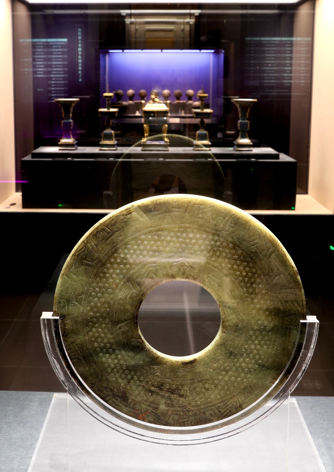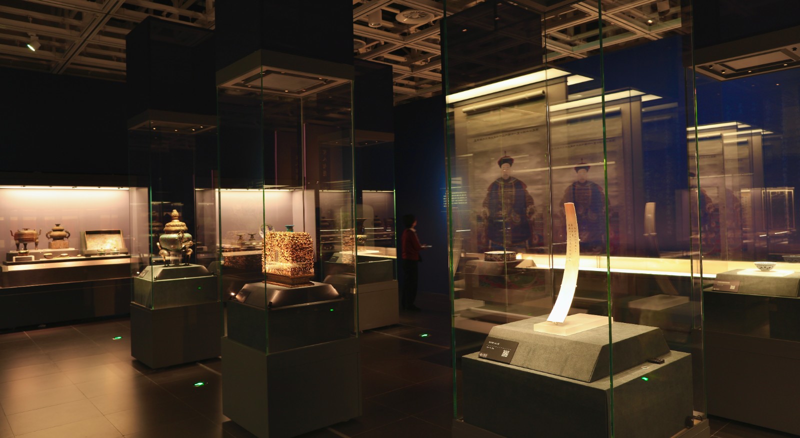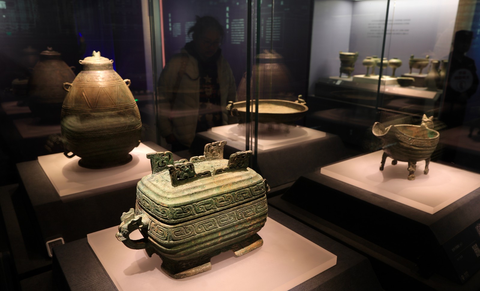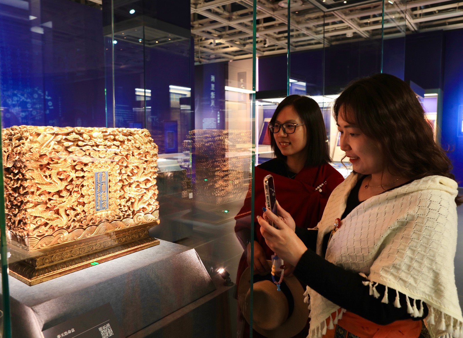 孔府旧藏掐丝珐琅夔龙纹长方盘、盖炉、铜簋、三镶白玉如意等展示。