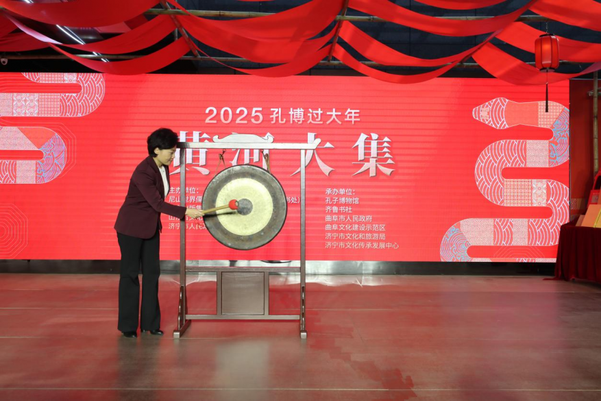 济宁市委常委、宣传部部长董冰为“博物馆里过大年 | 黄河大集”鸣锣开集。