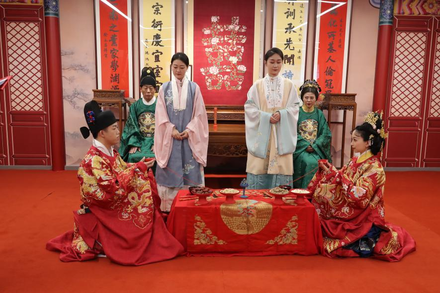 孔子博物馆孔博织造展厅中,一场传统的婚俗展示也喜庆登场。良辰吉日,嘉宾齐聚,一同赏雅乐、品佳肴、观美景,见证二人婚礼大喜,祝福新人永结秦晋之好,也以期通过这场仪式,重现华夏华美衣冠,弘扬华夏典雅仪范。