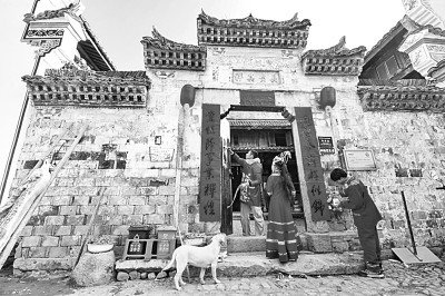 在浙江省金华市武义县大溪口乡山下鲍村,村民在贴对联。新华社发