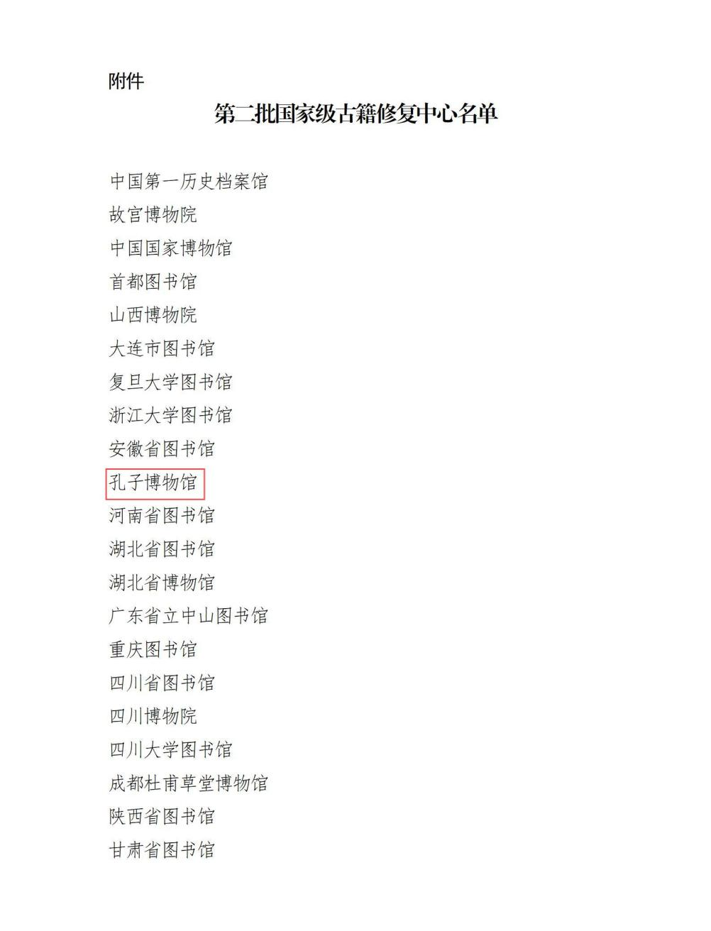 近日,文化和旅游部发布《文化和旅游部办公厅关于公布第二批国家级古籍修复中心名单的通知》(办公共发〔2025〕7号),孔子博物馆成功入选。