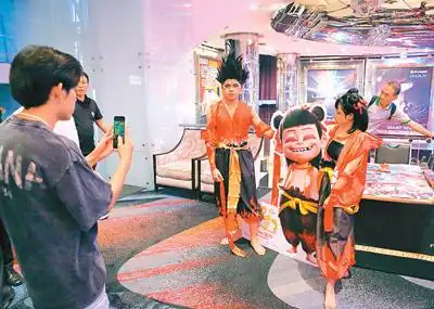 在泰国曼谷暹罗百丽宫,人们打扮成《哪吒之魔童闹海》中的角色与电影展板合影。 新华社记者 孙玮彤摄