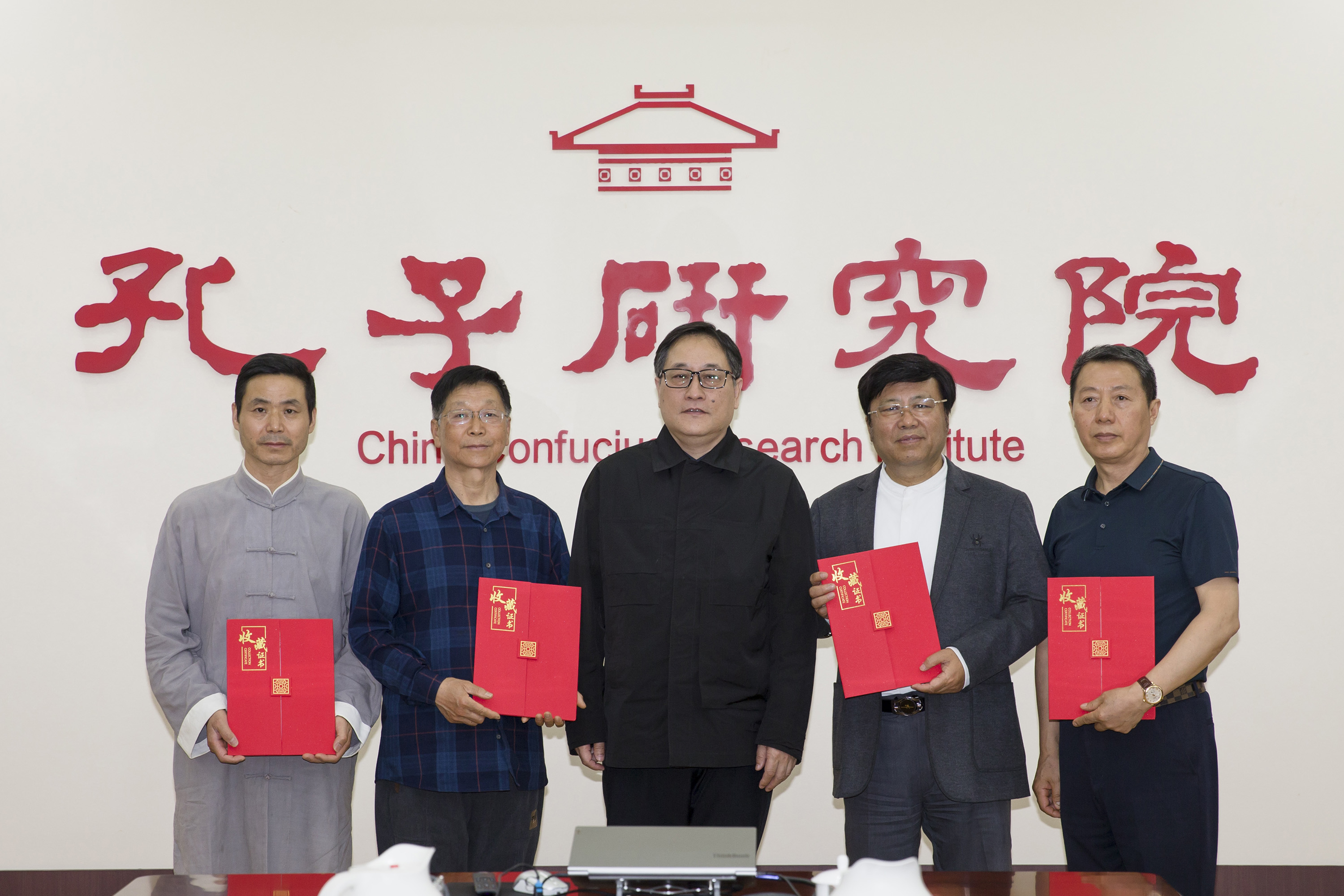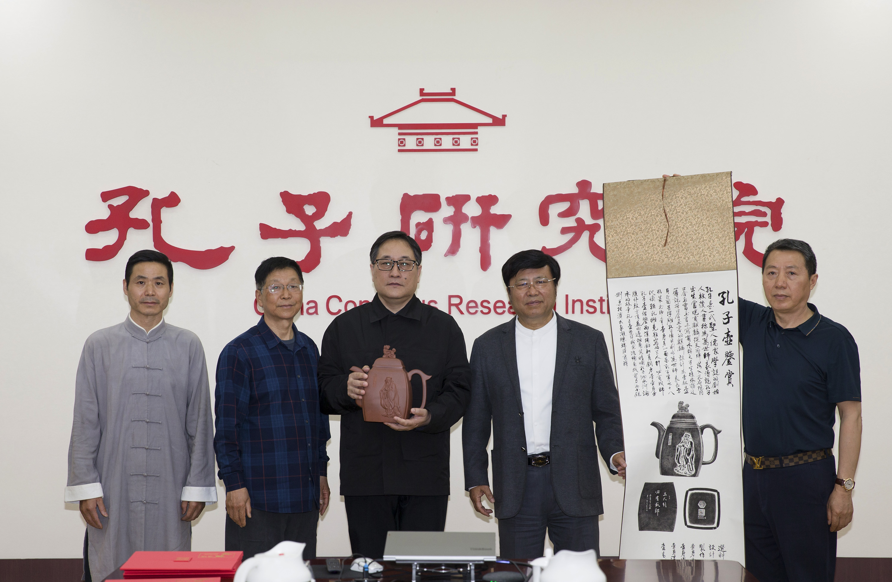 孔维克、吴建荣、季顺林、孔令武向孔子研究院捐赠紫砂壶《孔子》及拓片题跋,刘续兵接收捐赠作品并回赠收藏证书。