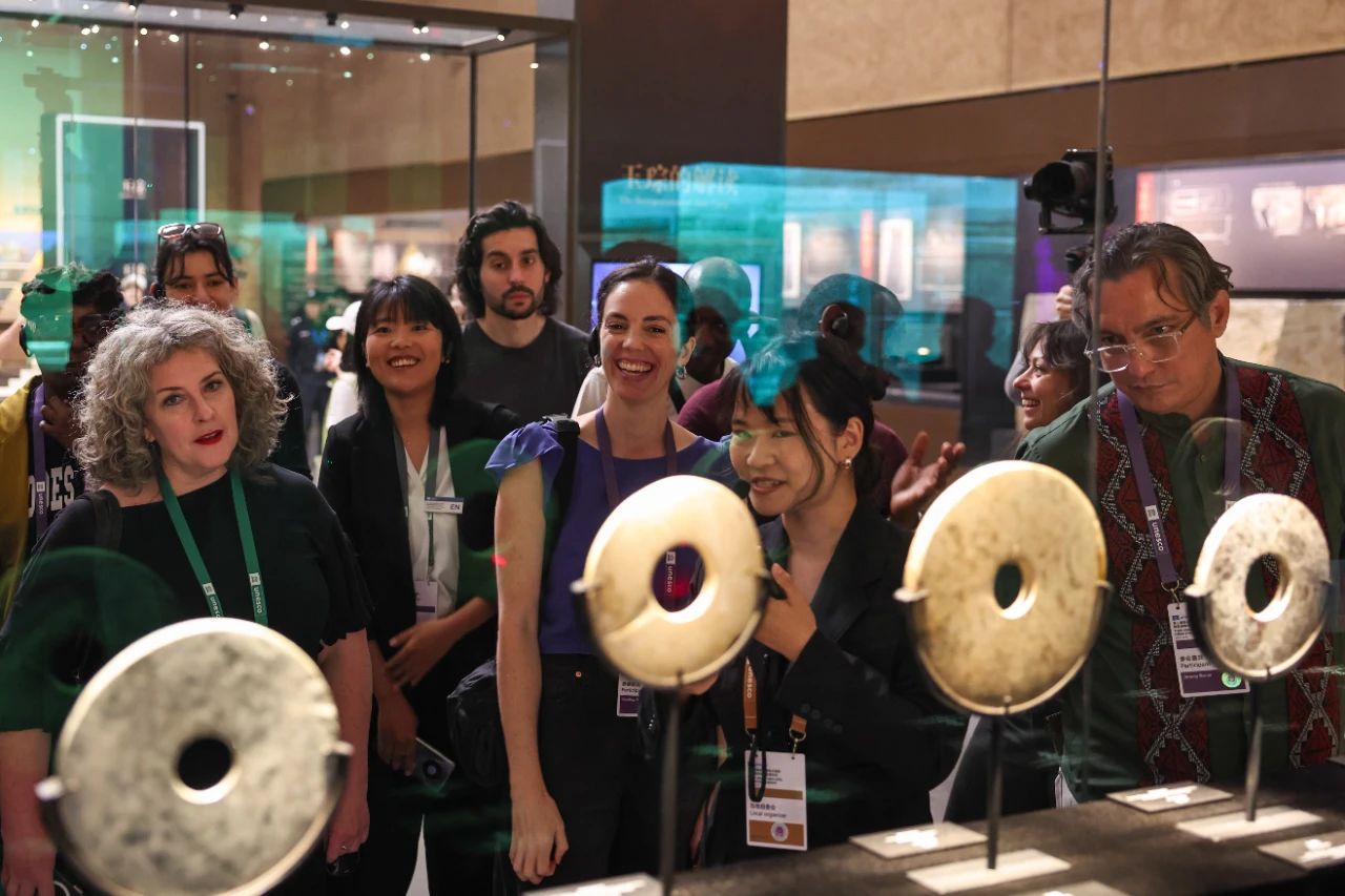 △4月23日,参加第三届联合国教科文组织国际博物馆高级别论坛的嘉宾在参观良渚博物院。新华社记者 江汉 摄