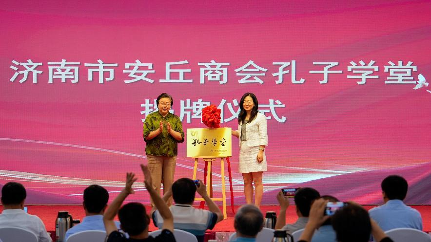 周静与商会党支部书记周永辉共同为济南市安丘商会孔子学堂揭牌。