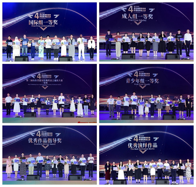 现场揭晓了“国际组一等奖”“成人组一等奖”“青少年组一等奖”“第二届山东省儒家经典跨语言诵读大赛一等奖”“优秀作品指导”“优秀演绎作品”等荣誉奖项。
