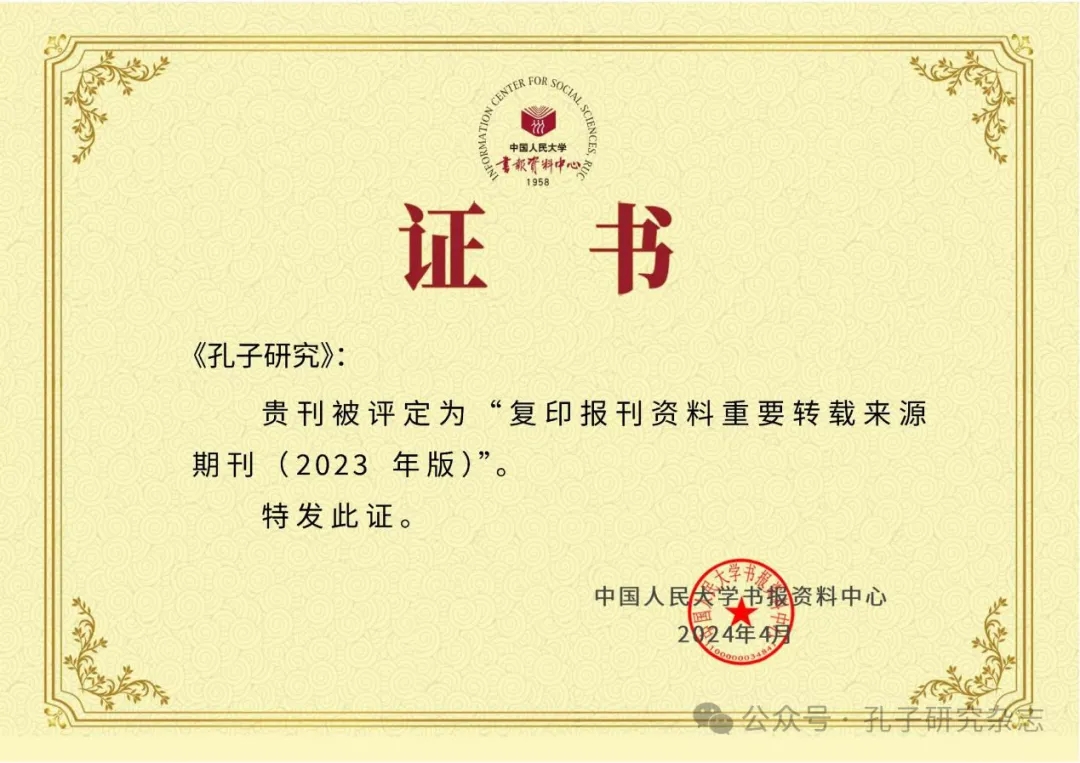 2024年4月25日,中国人民大学书报资料中心正式发布了《复印报刊资料重要转载来源期刊(2023年版)》。由中共山东省委宣传部主管、中国孔子基金会主办的《孔子研究》杂志入选。