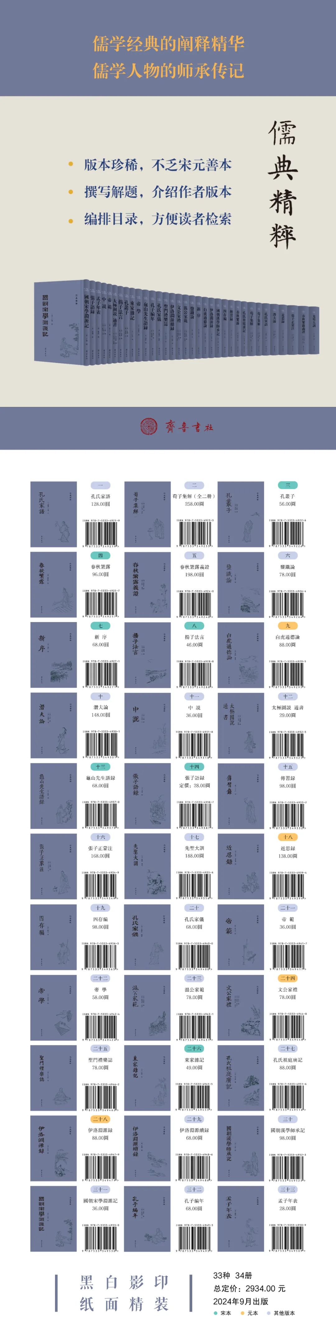 《儒典》是对儒家经典的一次精选和萃编,集合了儒学著作的优良版本,展示了儒学发展的历史脉络。其中,《义理典》《志传典》共收录六十九种元典,由齐鲁书社出版。鉴于《儒典》采用套书和线装的形式,部头大,价格高,不便于购买和日常使用,我们决定以《〈儒典〉精粹》为名,推出精装单行本。