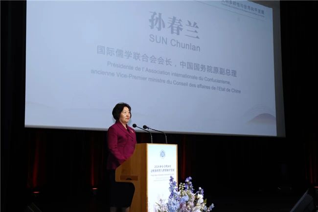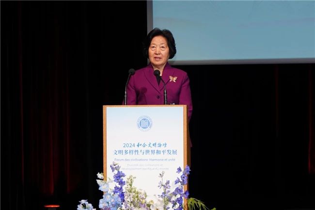 孙春兰向来自世界各地的与会嘉宾表示热烈欢迎和诚挚问候。她指出,2024和合文明论坛是落实习近平主席“全球文明倡议”和“传承中法建交精神、共促世界和平发展”要求,推动中华优秀传统文化走出去的一次重要实践。文明多样是世界的基本特征,无论哪种文明,都有尊重差异、追求合作、和平共处的基因。尊重文明多样性,推进多元文明之间的交流互鉴,才能携手应对共同挑战,推进人类文明进步与世界和平发展。
