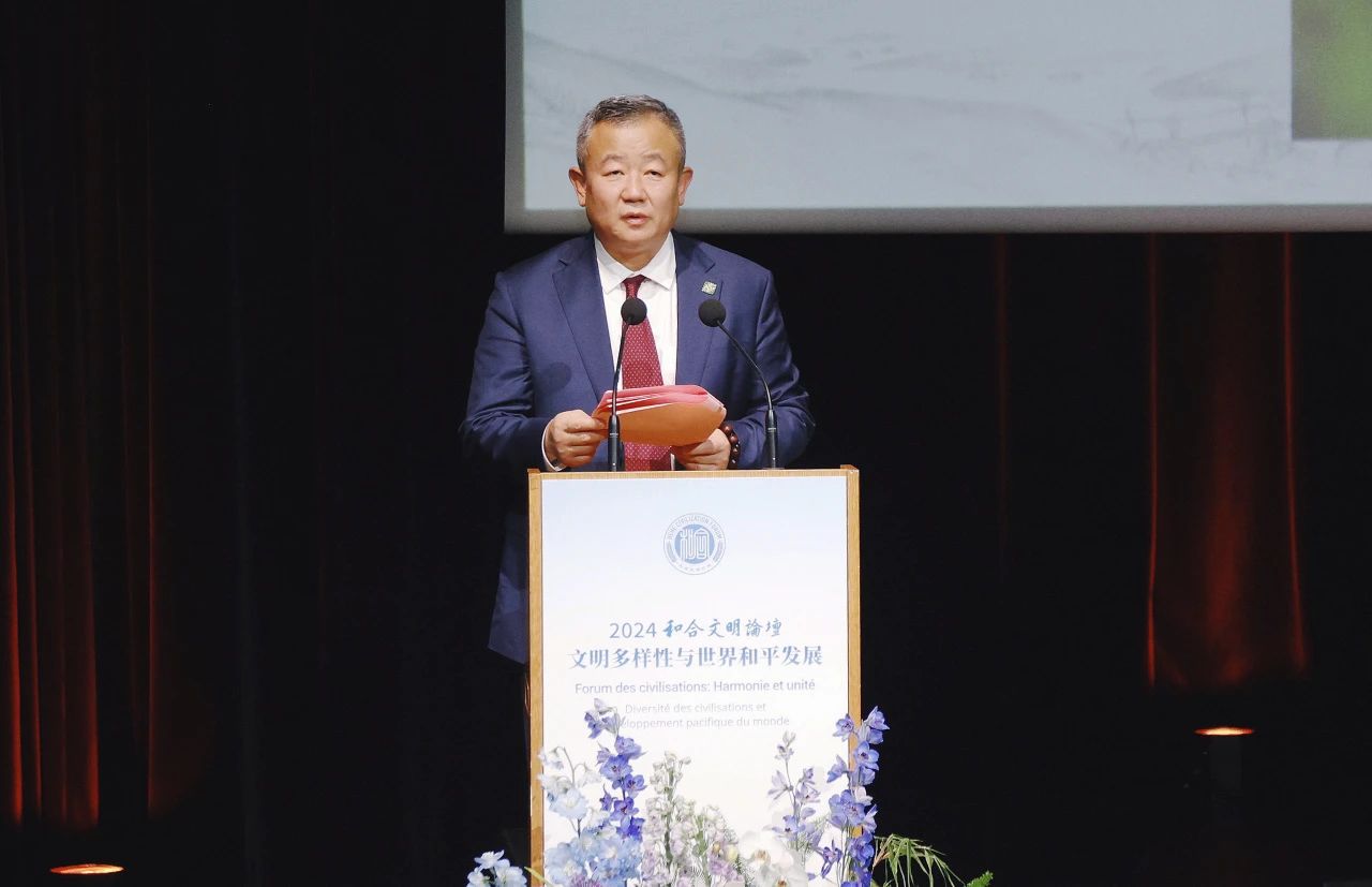 5月21日,由国际儒学联合会、中国人民对外友好协会、北京大学、法国展望与创新基金会共同主办的“2024和合文明论坛”在法国巴黎吉美国立亚洲艺术博物馆举办。国务院原副总理、国际儒学联合会会长孙春兰,法国前总理、展望与创新基金会主席拉法兰出席论坛开幕式并致辞,日本前首相、国际儒学联合会理事长福田康夫视频致辞,中国驻法国大使卢沙野、中国人民对外友好协会副会长李希奎、北京大学校务委员会主任郝平、巴黎吉美国立亚洲艺术博物馆总经理樊尚·比耶雷( Vincent Billerey ) 出席并致辞。国际儒学联合会常务副会长丁伟出席论坛开幕式,北京大学副校长方方主持。