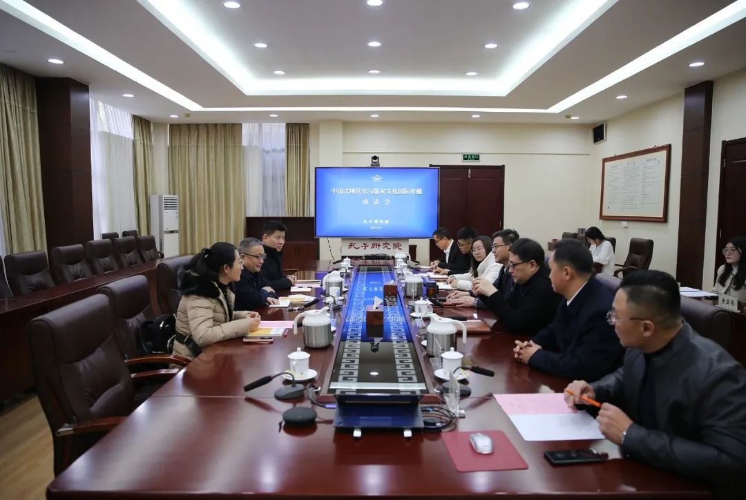 12月6日,中国外文局西欧与非洲传播中心(《今日中国》杂志社)副主任李五洲一行到访孔子研究院,就如何深入探寻中国式现代化道路背后的文化密码,更好地推动儒家文化国际传播进行专题调研座谈。尼山世界儒学中心(中国孔子基金会秘书处)党委委员、副主任,孔子研究院党委书记朱瑞显陪同调研并主持座谈会。孔子研究院党委委员、副院长、研究员刘续兵,中国外文局西欧与非洲传播中心中东分社社长彭楚云,中国外文局西欧与非洲传播中心英语传播部记者周琳及孔子研究院相关部室负责人参加座谈。