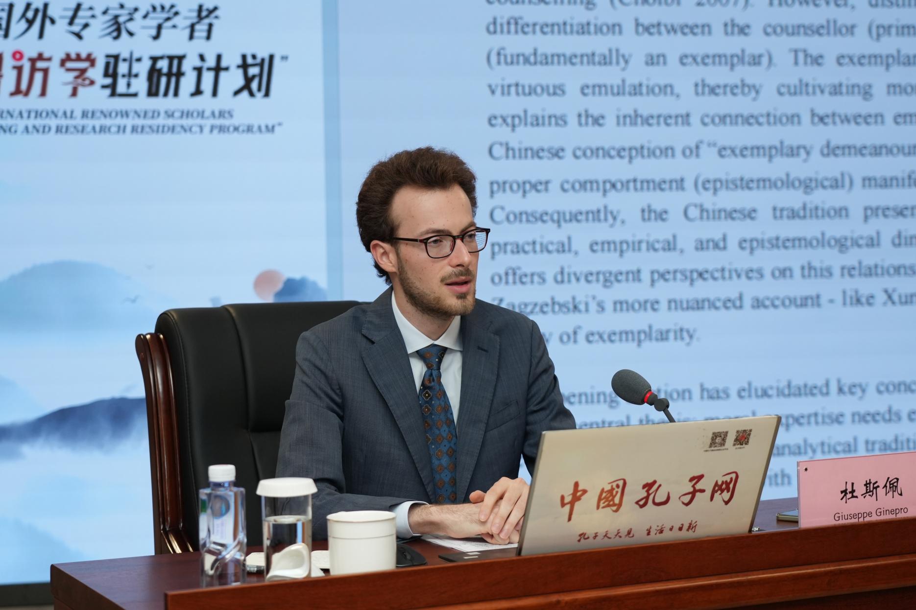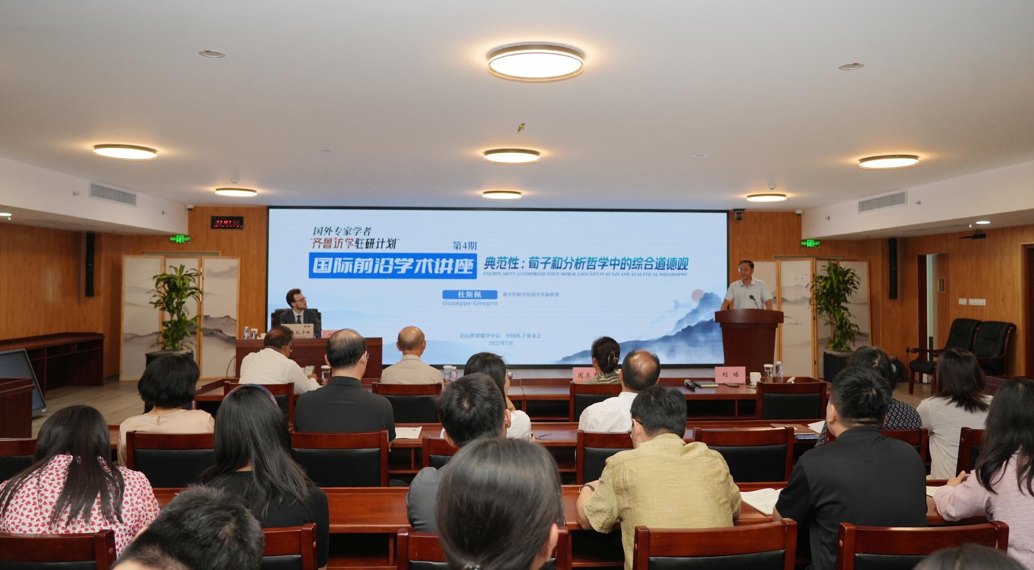 7月25日,尼山世界儒学中心(中国孔子基金会秘书处)举办国际前沿学术讲座(第4期)。“齐鲁访学驻研计划”访问学者、意大利联合校园大学副教授杜斯佩以《典范性:荀子和分析哲学中的综合道德观》为题开讲。尼山世界儒学中心(中国孔子基金会秘书处)党委书记、副主任、中国孔子基金会副理事长、秘书长国承彦出席活动,儒学中心(基金会秘书处)党委委员、副主任刘皓主持讲座。