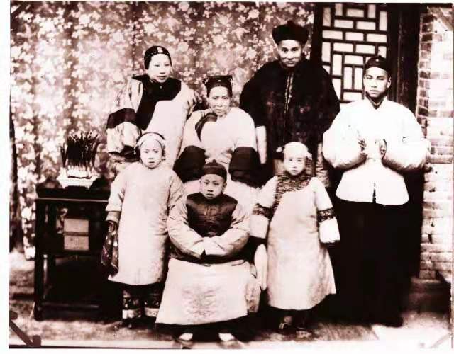 梁漱溟幼年时全家福,最前面端坐者为梁漱溟,后面黑色上衣站立者为其父梁巨川先生