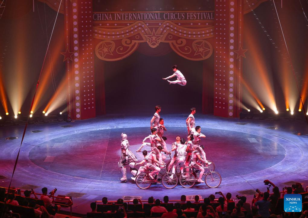 Acrobats from the China National Acrobatic Troupe perform during the 7th China International Circus Festival in Zhuhai, south China's Guangdong Province, Nov. 5, 2023. Nearly 200 acrobats from 18 countries and regions participated in the event. (Xinhua/Liu Dawei)