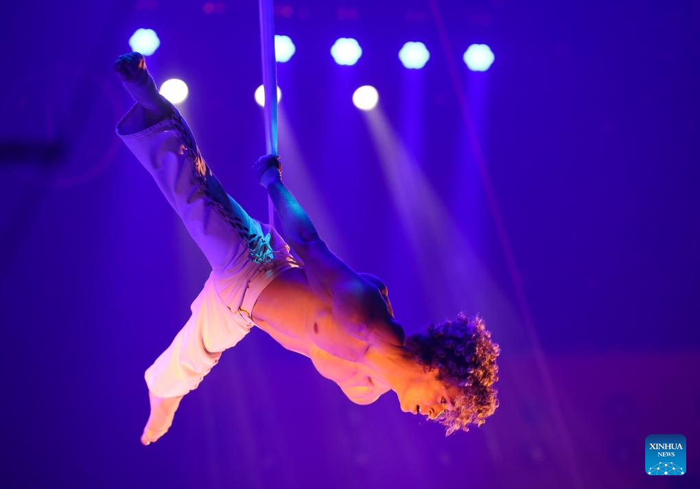 A Belgian artist performs during the 7th China International Circus Festival in Zhuhai, south China's Guangdong Province, Nov. 5, 2023. Nearly 200 acrobats from 18 countries and regions participated in the event. (Xinhua/Liu Dawei)
