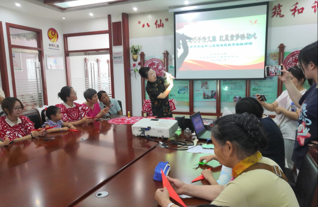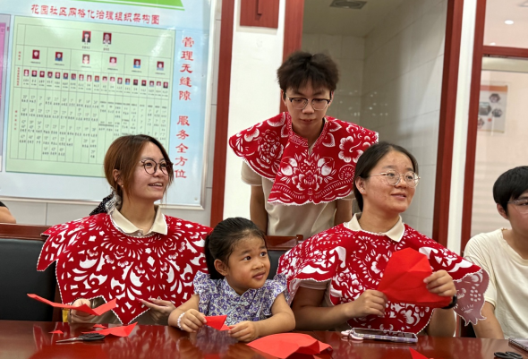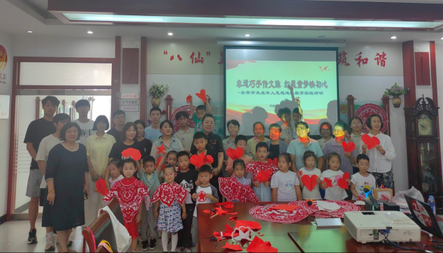 近日,泰山冯玉祥小学孔子学堂“纸言剪语”志愿服务队协助泰安市妇联、泰安市妇女儿童服务中心,走进泰安市岱庙街道花园社区开展未成年人思想道德教育实践活动,为社区居民、暑期大学生及30余名幼儿园大班小朋友带来了一场别开生面的非遗剪纸体验课。