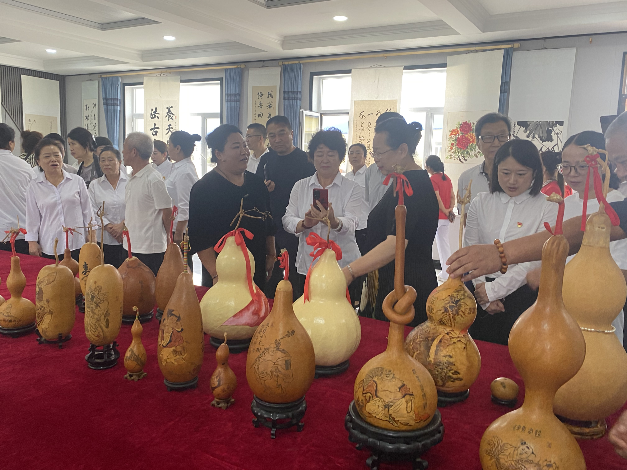 大家在孔子塑像前排成队列,举行了庄严肃穆的升国旗仪式,随后观看昌图县民间艺术家和书画家们创作的民间工艺品和书画作品。寓意“福禄”的葫芦工艺品首先吸引了人们的眼球,20多个形体不同的葫芦,规规矩矩“端坐”在展台上,既向人们昭示着“抗战胜利、福禄遍地”的精神内涵,又向人们展示着昌图县的“掐丝”“喷漆”“雕刻”三种葫芦制作工艺。