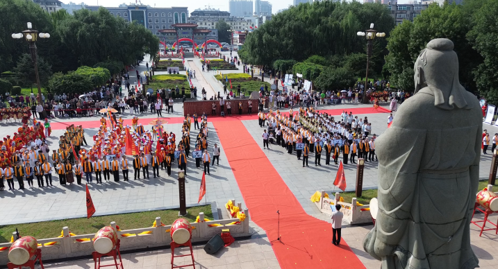上午8:30时起,文庙广场陆续迎来市民游客,秧歌武术、舞龙花棍、军乐打鼓、书画展览、烙印拓画、活字印刷、手工糖化、编制扎染、剪纸布艺等预热活动率先点燃文化氛围。9时50分,伴随着庄重的鼓声,祭孔典礼正式拉开帷幕。