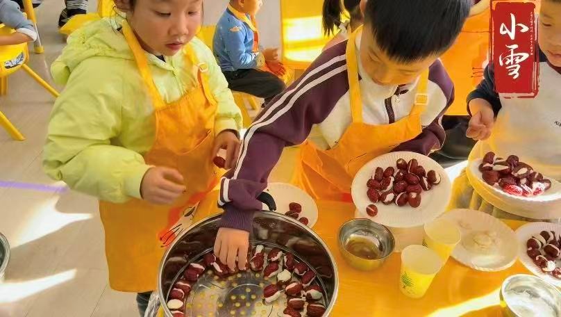 大班糯米枣制作同样热闹非凡。老师提前准备好糯米粉、红枣等食材,一步步教孩子们去核、填糯米、蒸制。孩子们认真地跟着老师操作,小手虽然稚嫩,却格外专注。当软糯香甜的糯米枣出锅,孩子们迫不及待地品尝这份冬日限定美味,在舌尖的暖意中,感受小雪节气的饮食习俗,也体会到动手制作的快乐。