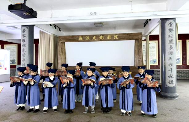 抵达水心村,导读老师首先带领孩子们走进村内文化礼堂,在古朴雅致的环境中,孩子们身着统一汉服,手捧《学庸论语》书本,齐声诵读《论语》篇章。琅琅书声回荡在礼堂内外,浓浓书香氤氲进美丽乡村,传统文化的韵味浸润心灵。