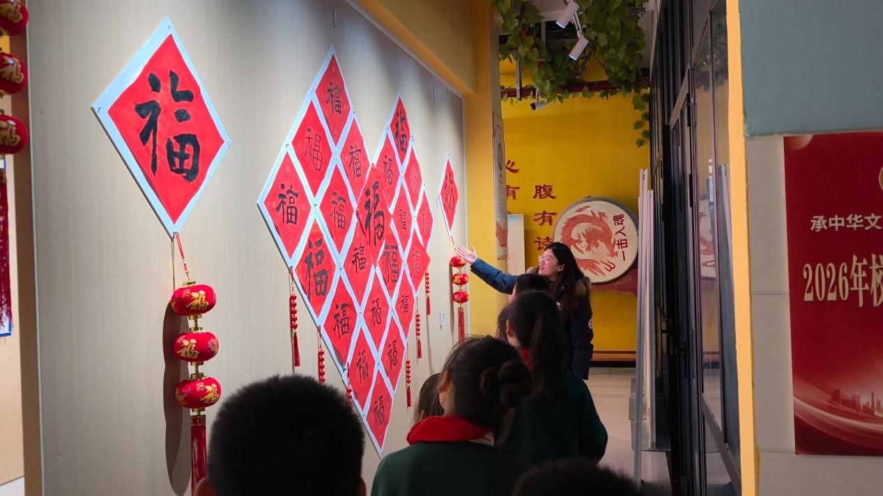 展览现场,一幅幅精心创作的作品吸引了众多师生驻足欣赏。同学们或驻足欣赏,或轻声交流,沉浸在艺术创作的氛围中。在手写福字展区,各式字体的“福”字各具特色,在笔墨流转中凝聚着美好的祝愿,也映衬出汉字文化的深厚底蕴;国画书法展区中,笔墨丹青之间展现出传统文化的韵味与力道;彩绘线描展区则以丰富的色彩和细腻的线条,描绘出孩子们眼中的美好世界与新年憧憬。