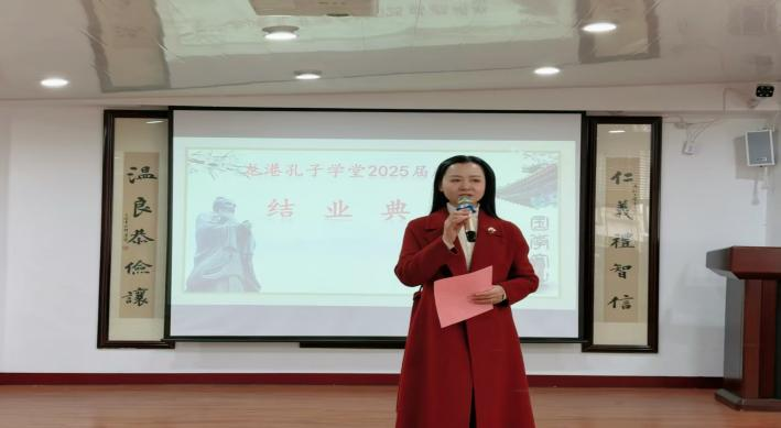 主持人登场后,结业典礼正式拉开帷幕,龙港孔子学堂负责人孔爱月老师首先发表了热情洋溢的致辞。她对颜渊班全体学员两年来的坚持与坚守给予充分肯定,真诚祝福全体学员的成长和收获;寄语学员们沐浴经典之光,持续从中华优秀传统文化中汲取养分,在学经典、悟经典、行经典的道路上从容优雅地走向更明亮的远方,让文脉传承生生不息。