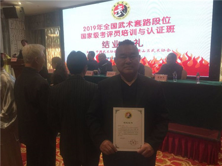 由国家体育总局武术运动管理中心主办的“2019全国武术段位制国家级考评员培训与认证”于4月14至18日在杭州举行。经过3天紧张而有序的武术理论讲课、评分与实践学习等环节,浙江嘉兴孔子学堂负责人韩海华顺利获得“国家级武术段位制考评员”资格。