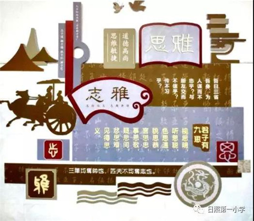 学校以“弘扬儒家文化,创建特色校园”为主旨,以儒雅校园文化为载体,秉承“让每一棵花草都能传情,让每一幅图画都能会意”的环境育人理念,以传统校园文化为载体,立足传承与创新,将传统文化与社会主义价值观结合,力争达到一草一木会说话,一画一花传儒雅,让极具时代特色的校园传统文化入校入班,入脑入心。