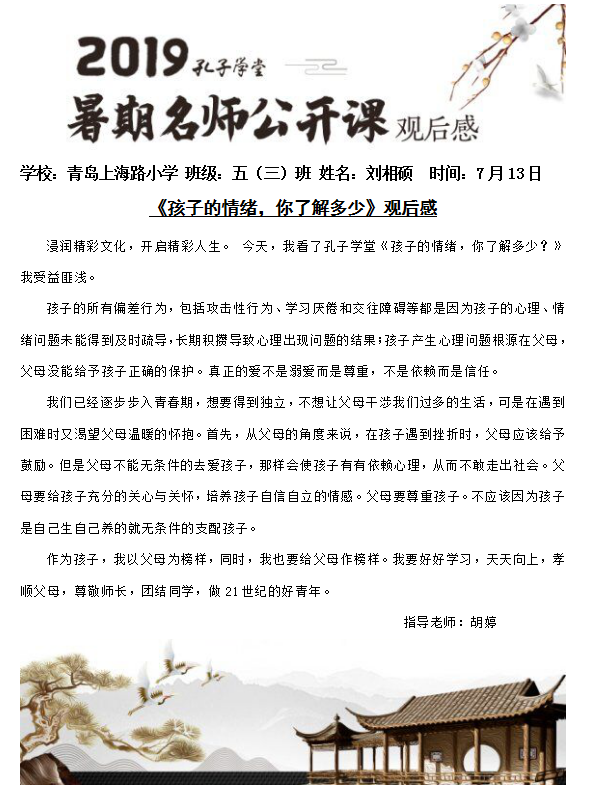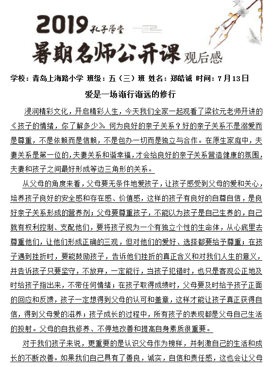 “知之,乐之,好之……”7月6日,2019孔子学堂暑期名师公开课正式开课,青岛上海路小学的孩子们跟随台湾大学哲学系教授傅佩荣走进“德不孤,必有邻”的《论语》世界;跟随梁钦元先生解析“亲子关系”中的“心理动因”,写下了一篇篇精彩体悟、感悟……