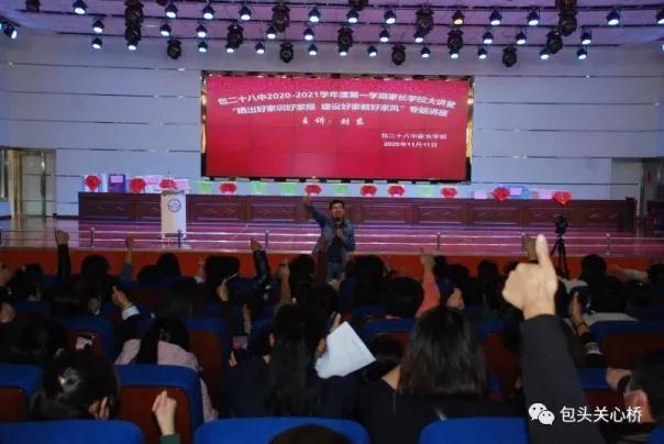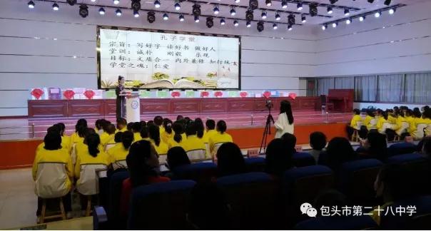 11月11日下午第三节课,包二十八中第二届“致青春”校园读书节启动仪式上,初一年级学生、家长、教师共计千人,在毓秀厅共同上了一节亲子诵读《论语》校本课程,这是包二十八中孔子学堂2020年的一场盛大活动。活动由包二十八中党支部书记、孔子学堂负责人邢莉主持。