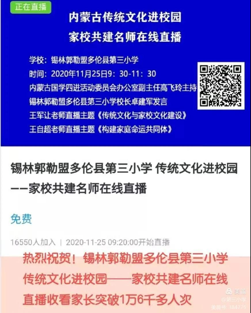 在内蒙古多伦县关心下一代委员会的引领下,锡林郭勒盟多伦县第三小学于2020年9月加入了“内蒙古中华优秀传统文化创新性传承研究”子课题,11月25日,在自治区关心下一代工作委员会和内蒙古国学四进活动委员会的关怀下,乘着传统文化进校园的东风,迎来了家校共建名师在线直播活动!