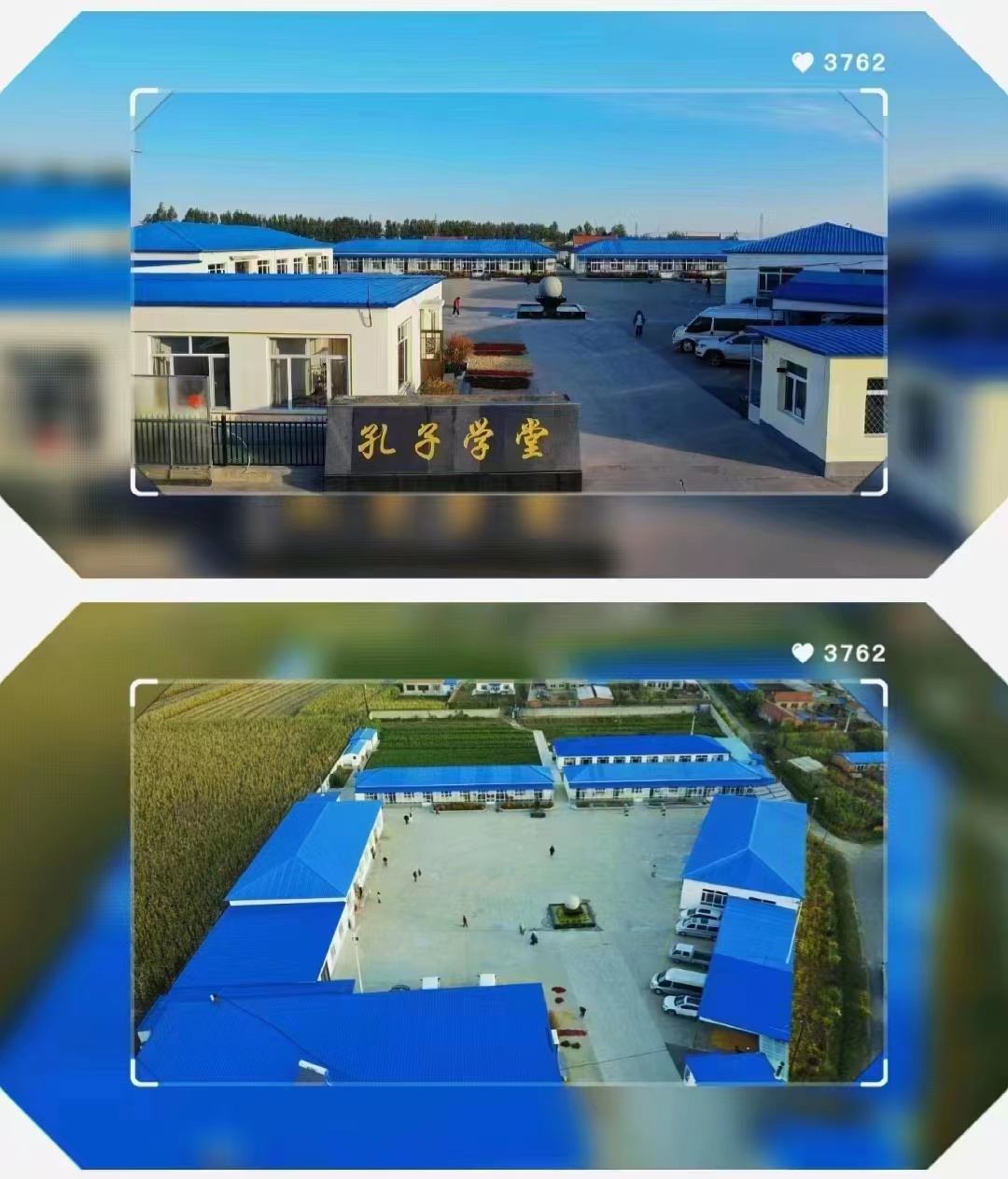 就在我们疑惑之时,随着车子的前行,在茂密的田野里,一处蓝色彩钢瓦的房屋若隐若现,那就是孔子学堂!有文友惊呼。好安静、好诗意的田园风光,真好比世外桃源啊。五分钟后,我们来到孔子学堂门前。“孔子学堂”四个金黄色的大字映入眼帘,抬眼望去,这是个很宽敞的四合大院,院子里最醒目的标志物是高高飘扬的五星红旗,让人顿生敬仰之情!房子的房顶都是蓝色彩钢瓦的,房子的墙身是白色的,蓝白两种颜色相互交织,给人一种清新、舒适的视觉。