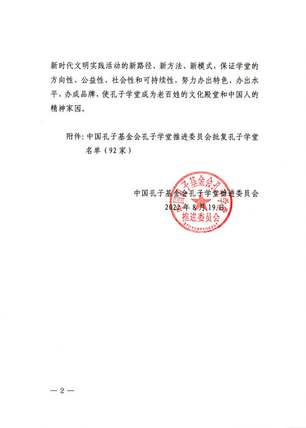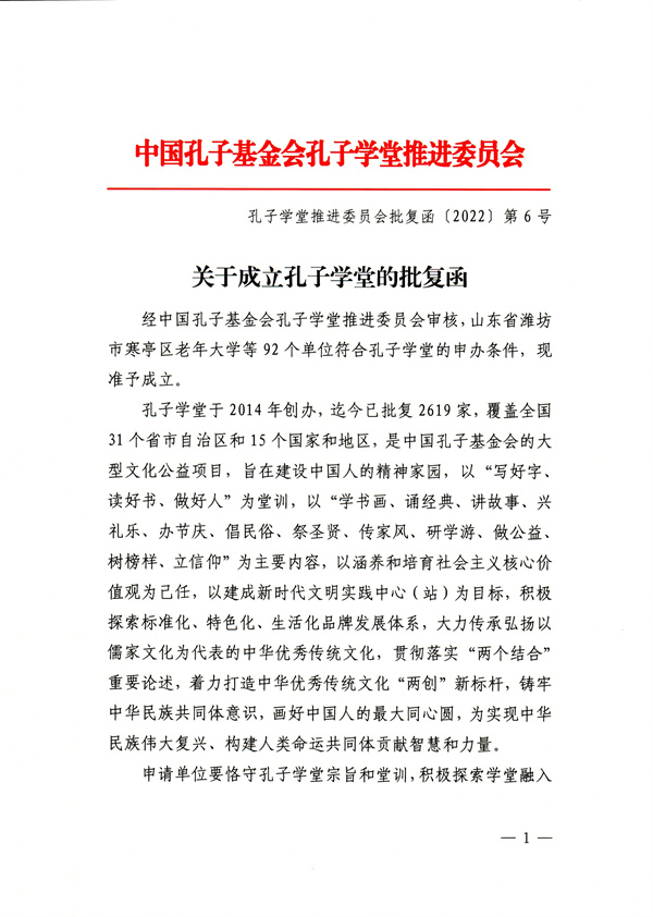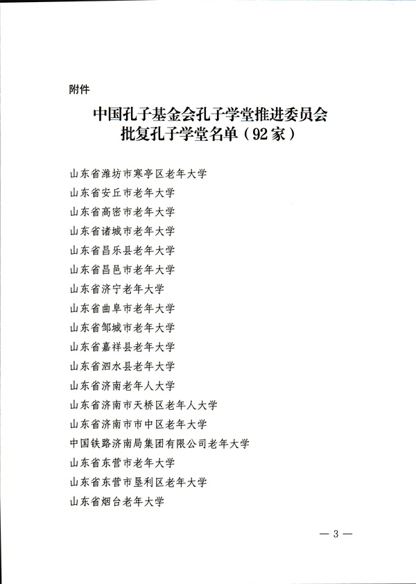 经中国孔子基金会孔子学堂推进委员会审核,山东省潍坊市寒亭区老年大学等92个单位符合孔子学堂的申办条件,现准予成立。