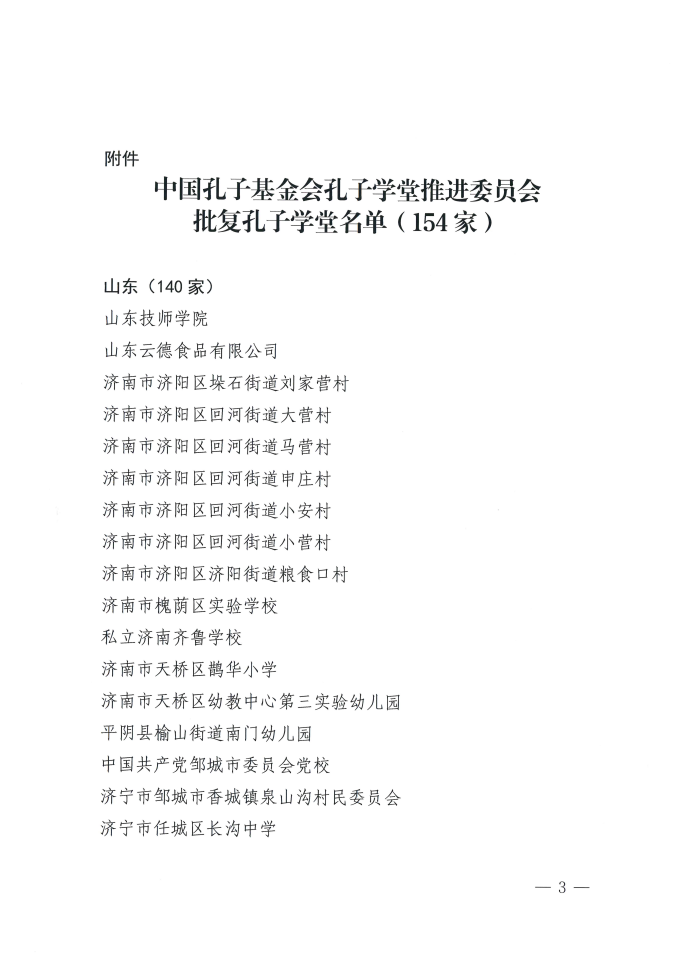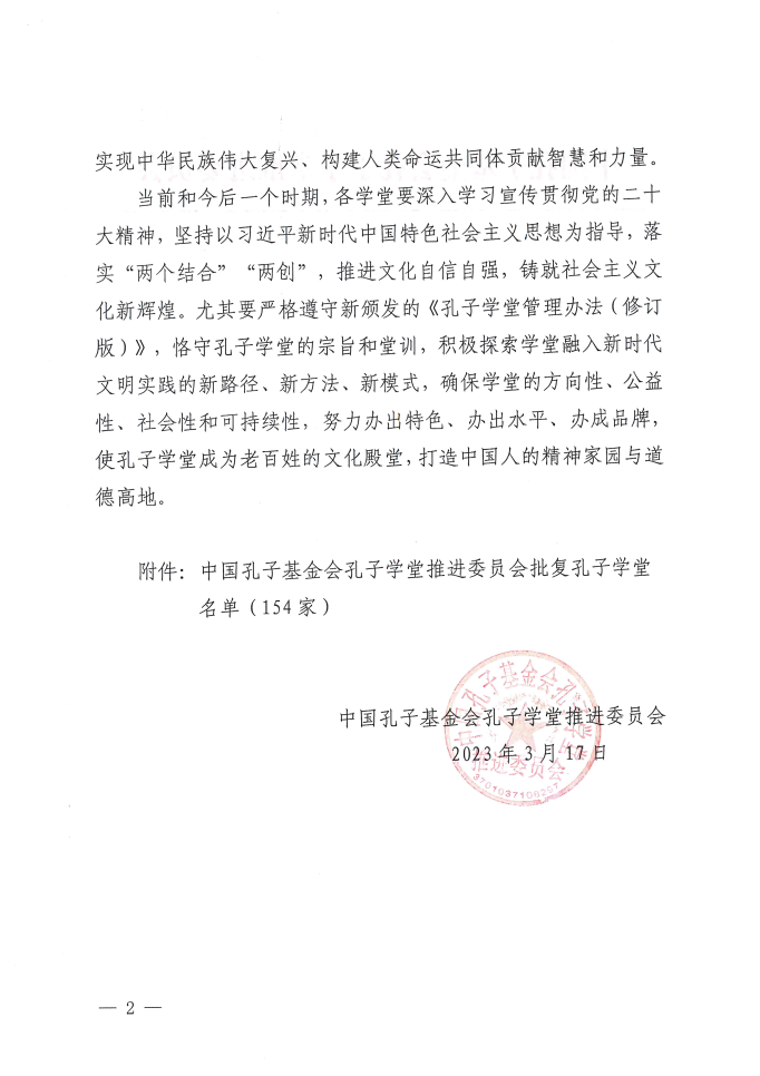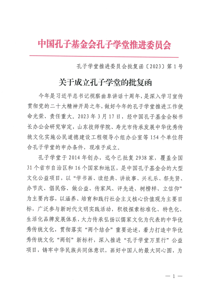 2023年3月17日,经中国孔子基金会秘书长办公会研究审定,山东技师学院、寿光市传承发展中华优秀传统文化实施公民道德建设工程领导小组办公室等154个单位符合孔子学堂的申办条件,现准予成立。