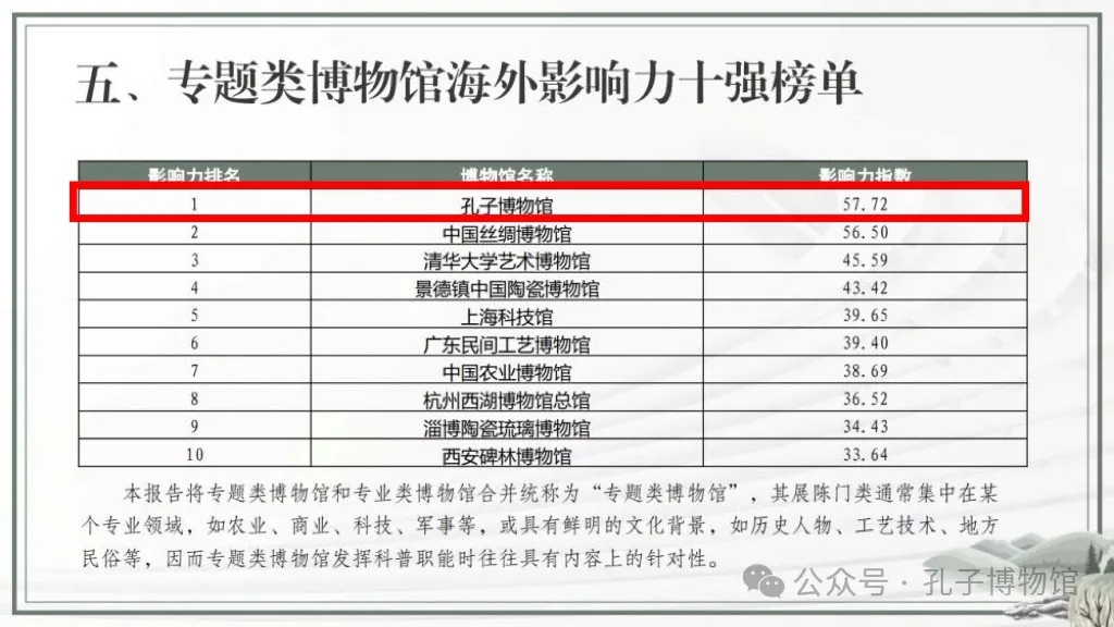 2024年5月18日,《2023年度全国博物馆(展览)海外影响力评估报告》在“博物馆(展览)海外传播交流会”上正式发布。孔子博物馆荣登2023年度全国博物馆(展览)海外影响力百强榜单,位列第7名,以及专题类博物馆海外影响力十强榜单,位列第1名,荣获“2023年全国博物馆(展览)海外影响力精品案例二十强”。这是孔子博物馆首次入围海外影响力百强名单,也是山东省入选综合影响力TOP10和专题类影响力前十名的唯一一座博物馆。